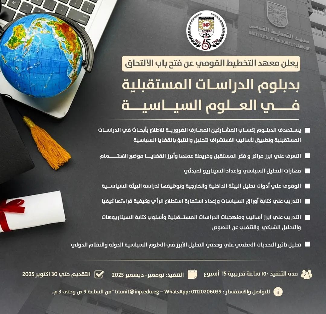 يعلن معهد التخطيط القومي عن فتح باب الالتحاق بدبلوم الدراسات المستقبلية في العلوم السياسية