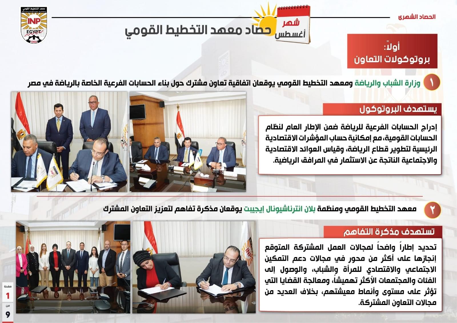 وقد أبرز التقرير الصادر عن المعهد توقيع اتفاقية تعاون مشترك بين معهد التخطيط القومي ووزارة الشباب والرياضة حول بناء الحسابات الفرعية الخاصة بالرياضة في مصر بهدف إدراج الحسابات الفرعية للرياضة ضمن الإطار العام لنظام الحسابات القومية مع إمكانية حساب المؤشرات الاقتصادية والاجتماعية الناتجة عن الاستثمار في المرافق الرياضية.