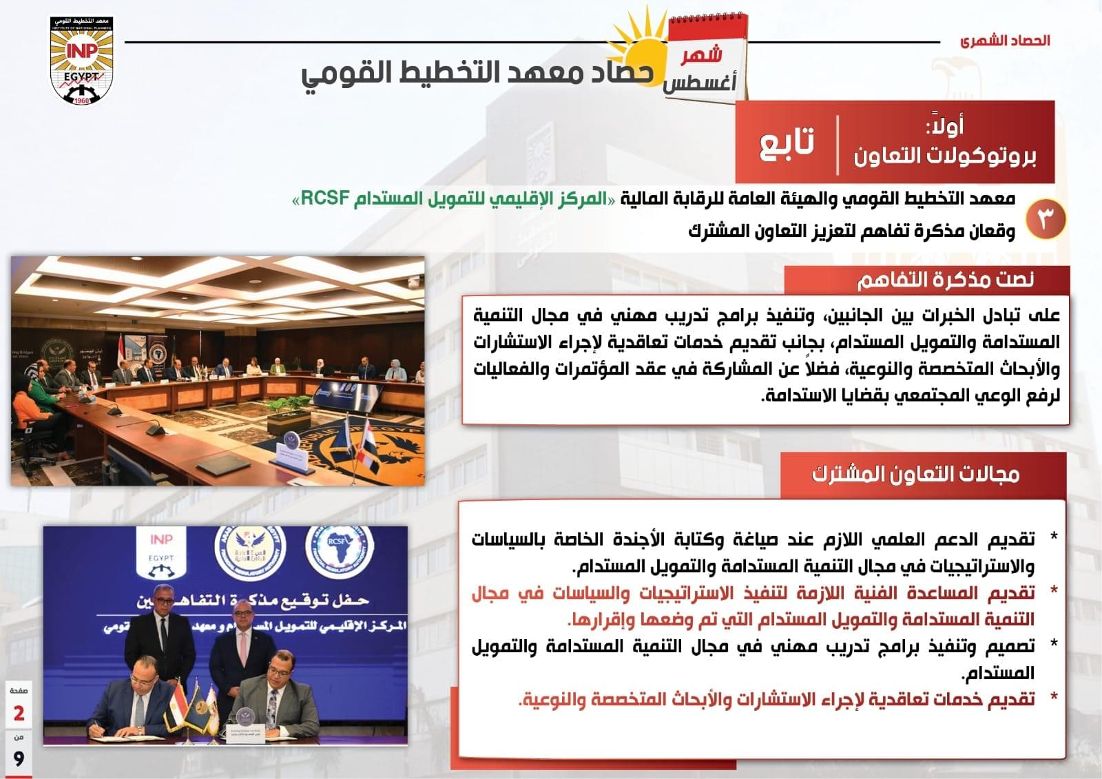 نشر معهد التخطيط القومي تقرير “حصاد أغسطس 2023” حيث يسلط من خلاله الضوء على الأنشطة والفعاليات التي نفذها خلال شهر أغسطس، والتي تنوعت ما بين بروتوكولات التعاون ولقاءات رئيس المعهد ونوابه، إضافة إلى الدراسات العليا والأنشطة البحثية، والندوات، فضلاً عن البرامج التدريبية والاستشارات الفنية التي قدمها المعهد.