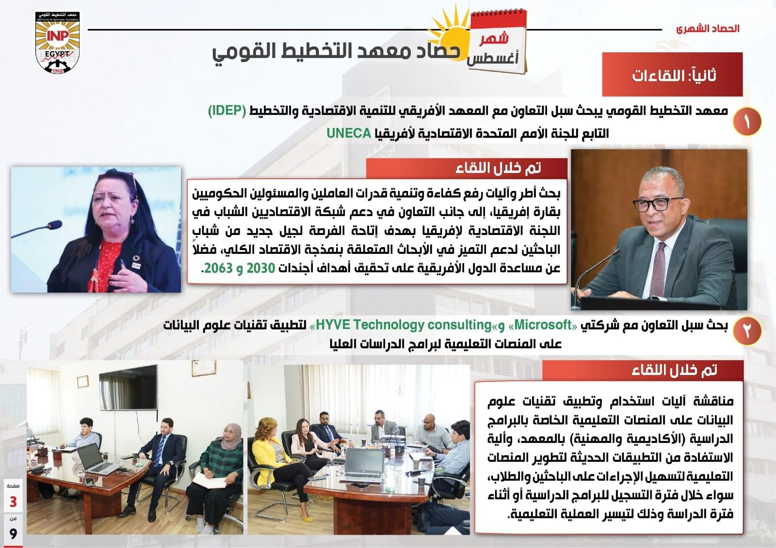 وشمل الحصاد، وفقاً للتقرير لقاء رئيس معهد التخطيط القومي مع رئيس المعهد الأفريقي للتنمية الاقتصادية والتخطيط التابع للجنة الأمم المتحدة الاقتصادية لأفريقيا، لبحث أطر وآليات رفع كفاءة وتنمية قدرات العاملين والمسئولين الحكوميين بقارة أفريقيا، إلى جانب التعاون في دعم شبكة الاقتصاديين الشباب في اللجنة الاقتصادية لأفريقيا.