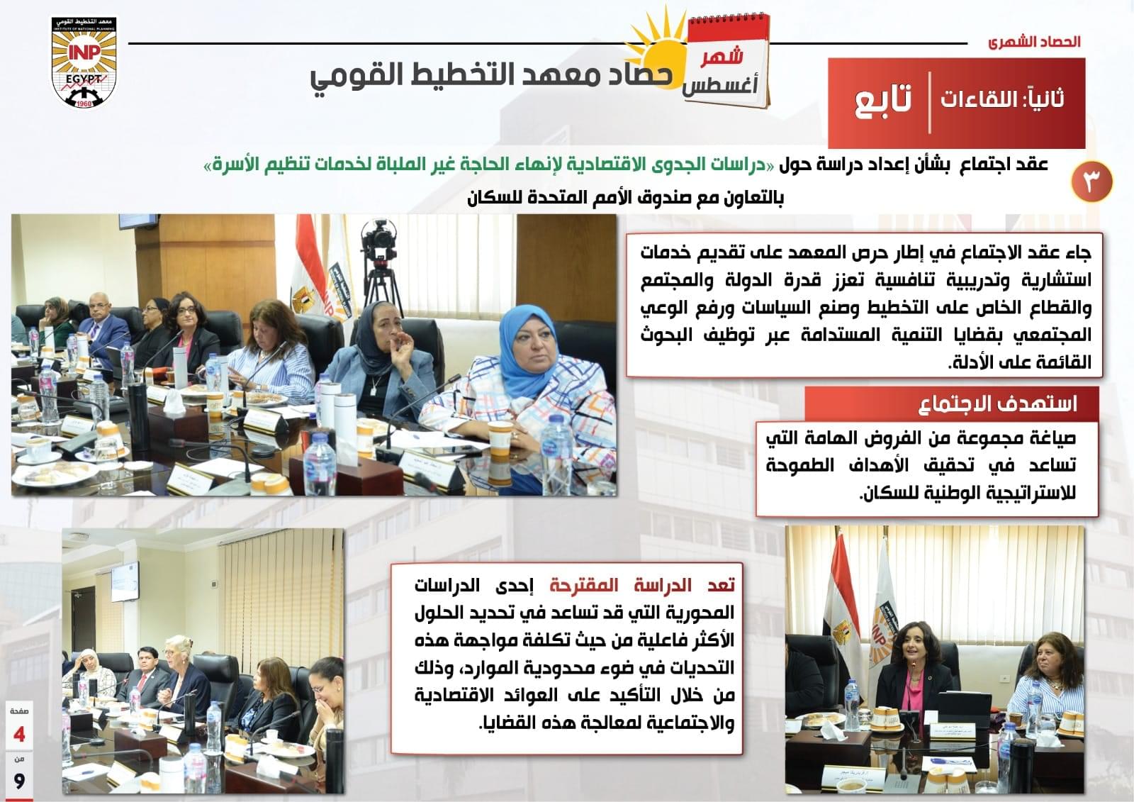 وتطرق التقرير عقد اجتماع بشأن إعداد دراسة حول “دراسات الجدوى الاقتصادية لإنهاء الحاجة غير المُلباة لخدمات تنظيم الأسرة” بالتعاون مع صندوق الأمم المتحدة للسكان، حيث استهدف الاجتماع صياغة مجموعة من الفروض الهامة التي تساعد في تحقيق الأهداف الطموحة للاستراتيجية الوطنية للسكان.