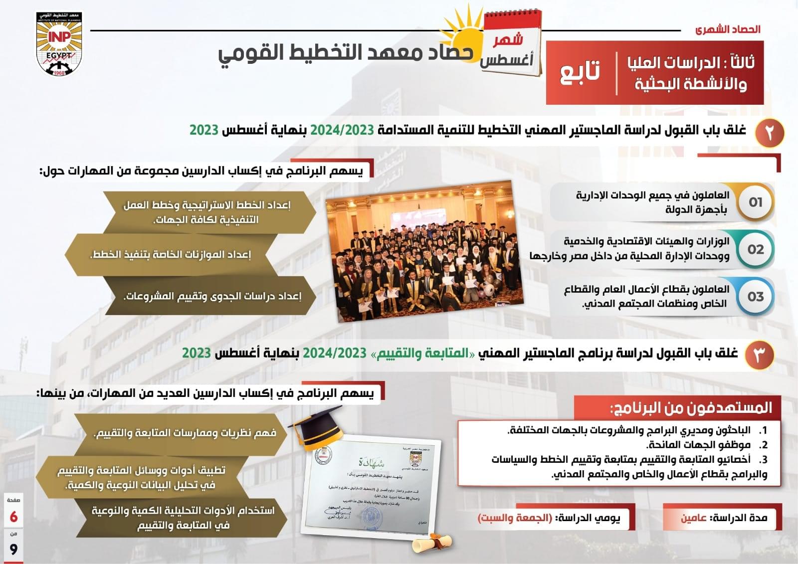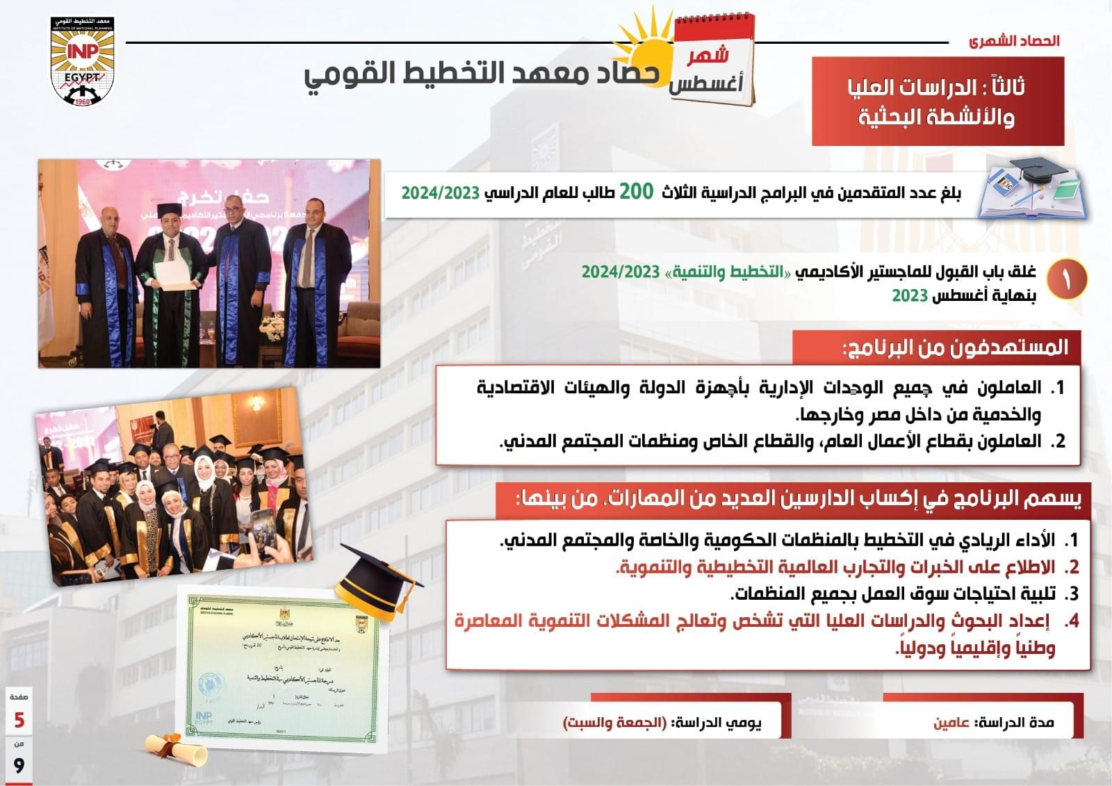 وأشار التقرير إلى غلق باب التقدم لبرامج الأنشطة البحثية وبرامج الدراسات العليا بالمعهد بنهاية شهر أغسطس وهي الماجستير المهني “التخطيط للتنمية المستدامة” والماجستير المهني في “المتابعة والتقييم” والماجستير الأكاديمي “التخطيط والتنمية” حيث بلغ عدد المتقدمين في البرامج الثلاث 200 طالب للعام الدراسي 2023/2024.