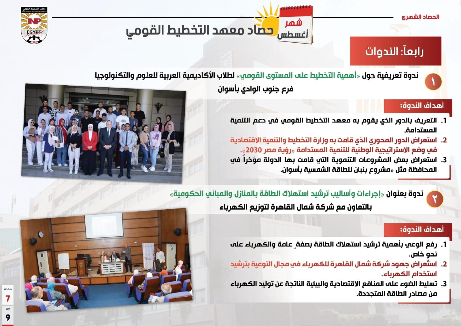 وسلط الحصاد الضوء كذلك على مجموعة الندوات التي عقدها المعهد وتشمل ندوة تعريفية حول أهمية التخطيط على المستوى القومي لطلاب الأكاديمية العربية للعلوم والتكنولوجيا فرع جنوب الوادي بأسوان، وندوة “إجراءات وأساليب ترشيد استهلاك الطاقة بالمنازل والمباني الحكومية” بالتعاون مع شركة شمال القاهرة لتوزيع الكهرباء.