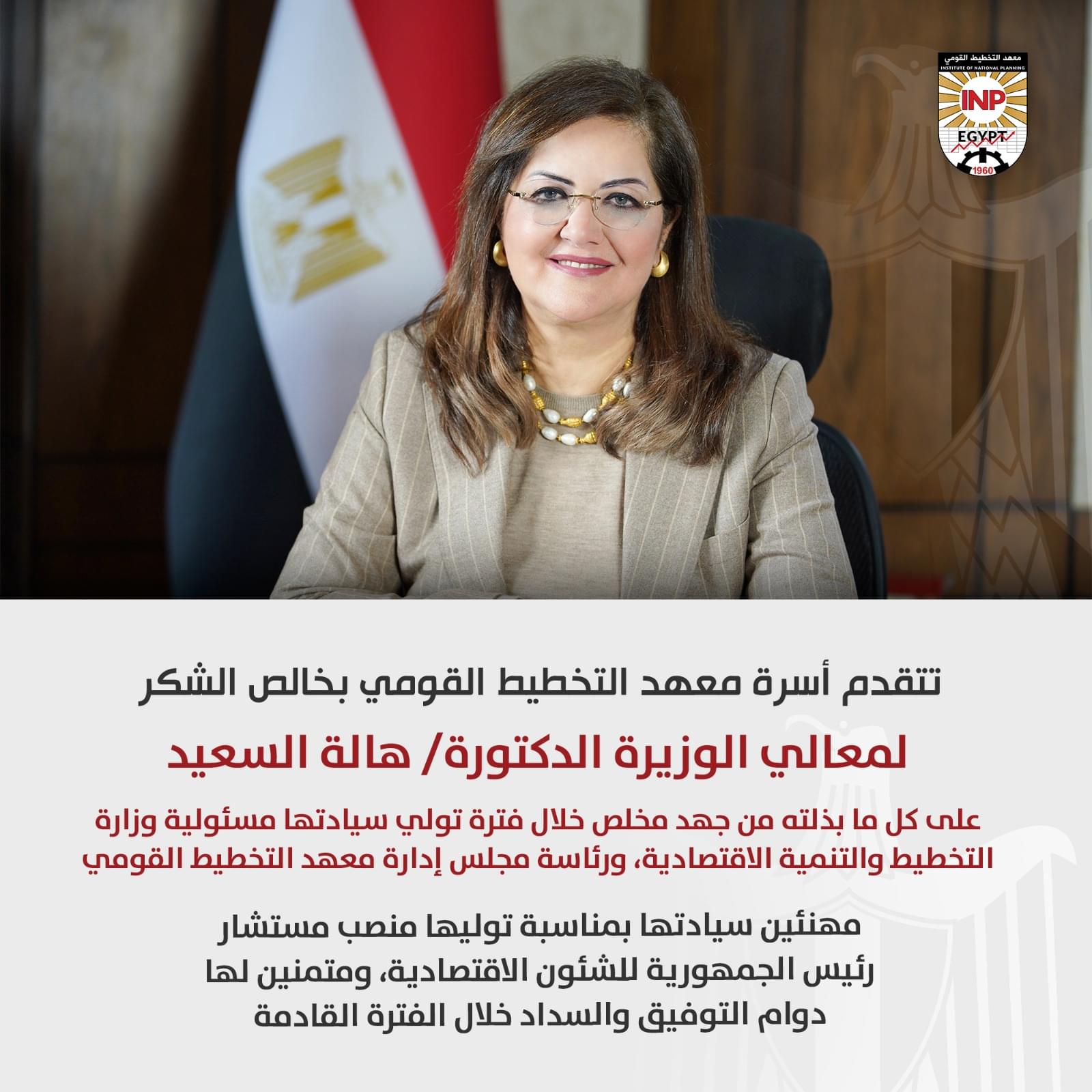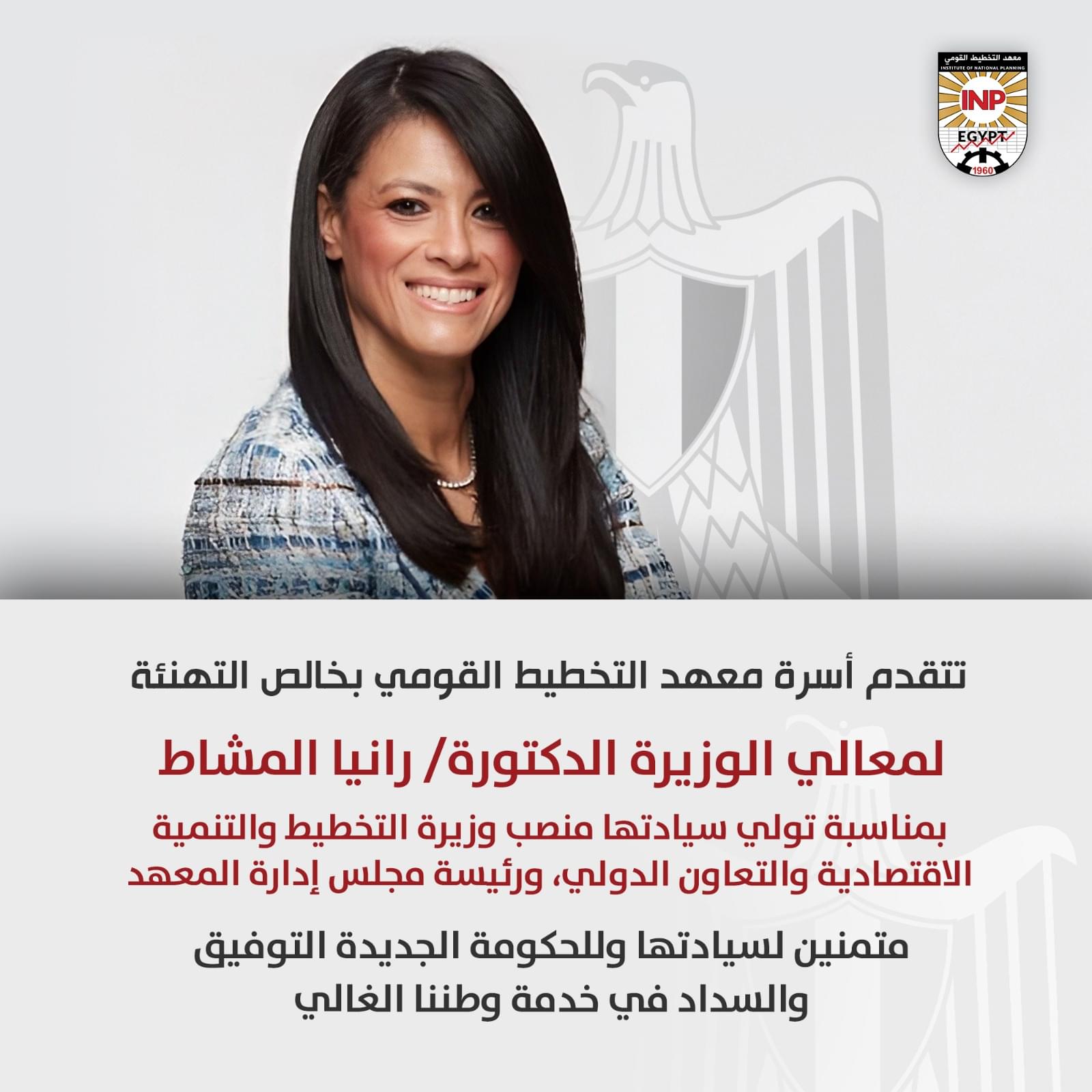 تتقدم أسرة معهد التخطيط القومي بخالص التهنئة لمعالي الوزيرة الدكتورة/ رانيا المشاط بمناسبة تولي سيادتها منصب وزيرة التخطيط والتنمية الاقتصادية والتعاون الدولي، ورئيسة مجلس إدارة المعهد متمنين لسيادتها وللحكومة الجديدة التوفيق والسداد في خدمة وطننا الغالي.