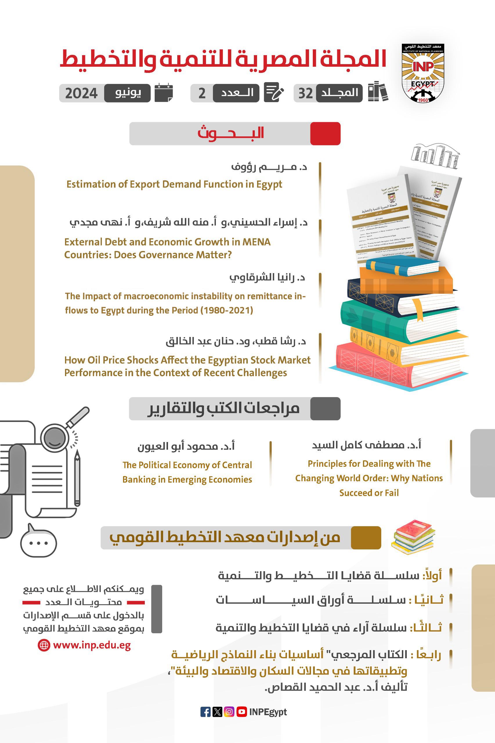 أصدرت المجلة المصرية للتنمية والتخطيط دراسة جديدة بعنوان ” تقدير دالة الطلب على الصادرات في مصر” ضمن عدد يونيو 2024، من إعداد د. مريم رؤوف مدير وحدة النمذجة بمعهد التخطيط القومي.