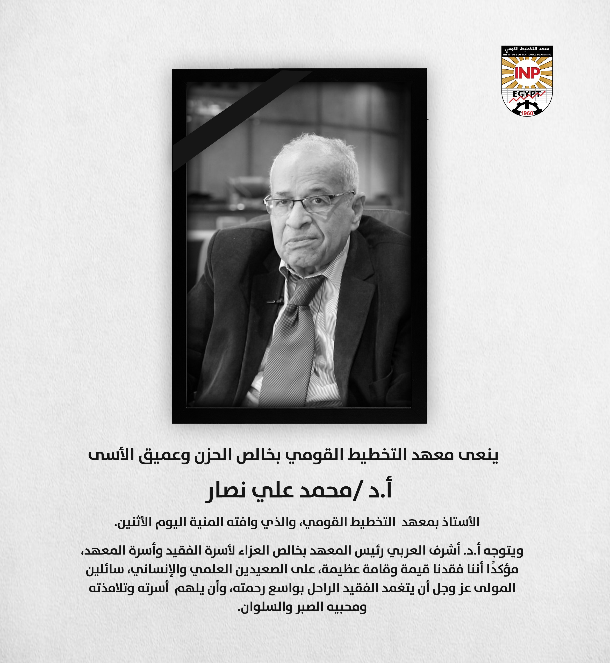 ينعى معهد التخطيط القومي بخالص الحزن وعميق الأسى، أ.د/ محمد علي نصار الأستاذ بمعهد التخطيط القومي، والذي وافته المنية اليوم الأثنين.