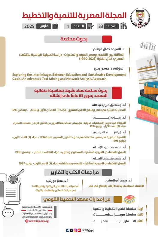 أصدر معهد التخطيط القومي عدداً جديداً من المجلة المصرية للتنمية والتخطيط، وهو عدد مارس 2025، ويحتوي هذا العدد على بحثين مٌحكمين وذلك على النحو التالي: