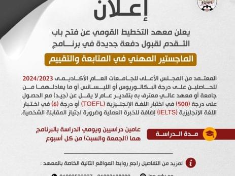 أعلن معهد التخطيط القومي فتح باب التقدم لقبول دفعة جديدة في برنامج الماجستير المهني في "المتابعة والتقييم" المعتمد من ا...