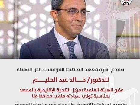 عضو الهيئة العلمية بمركز التنمية الإقليمية بالمعهد بمناسبة تولي سيادته منصب محافظ قنا، متمنين لسيادته التوفيق والسداد ف...