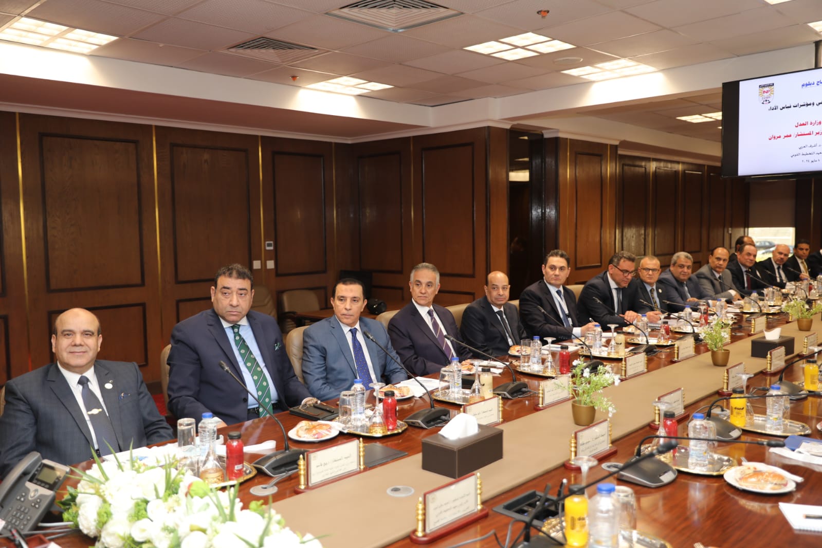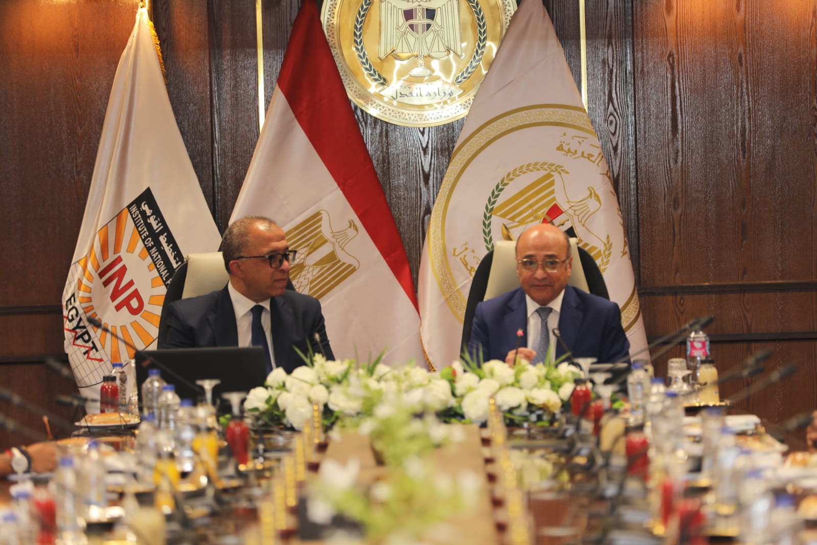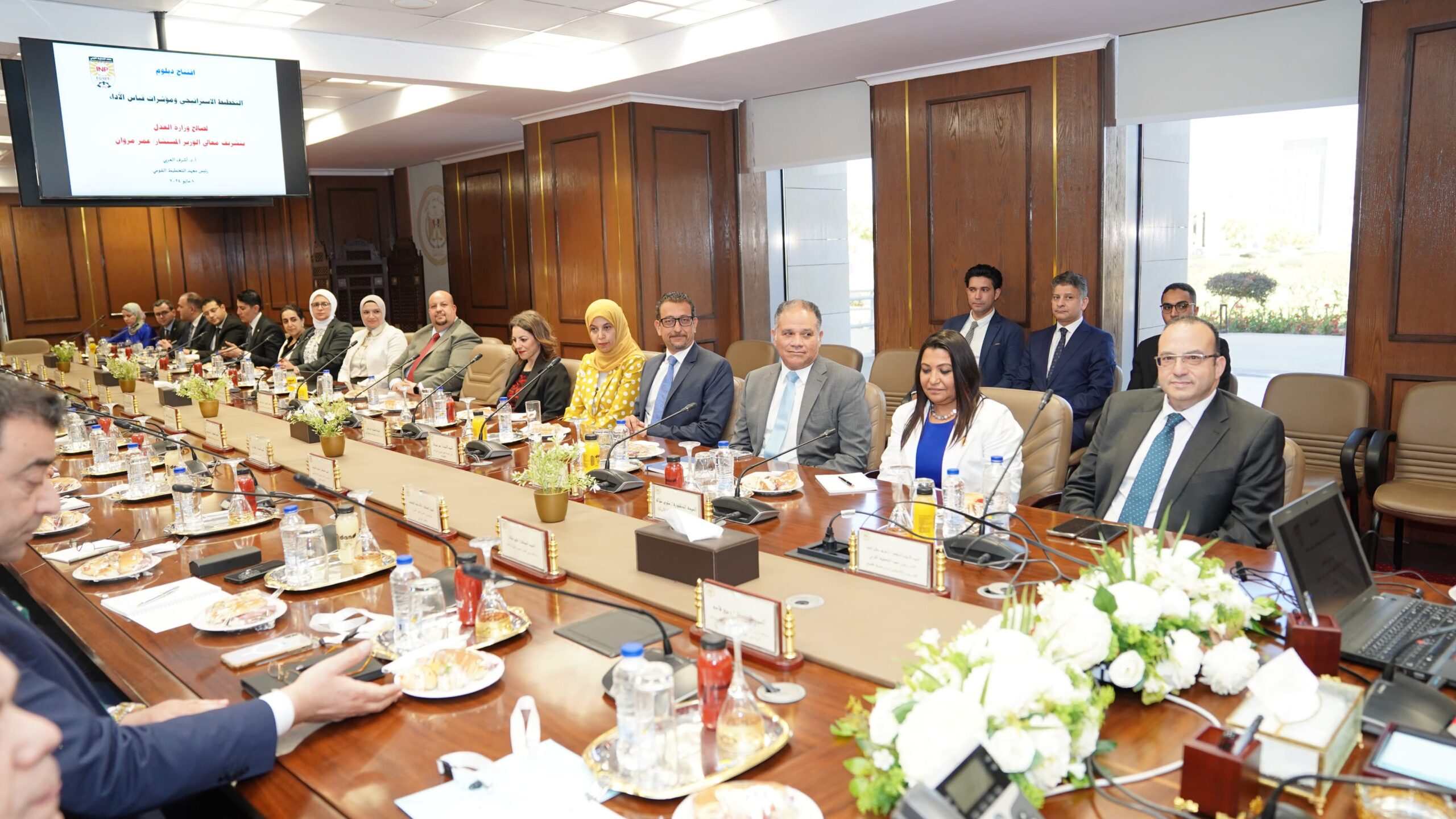 As part of the Ministry of Justice’s commitment to enhancing human resource capabilities and developing strategic planning competencies, H.E. Counselor Omar Marwan, Minister of Justice, and Prof. Dr. Ashraf El-Araby, President of the Institute of National Planning (INP) and former Minister of Planning, inaugurated the “Strategic Planning and Performance Indicators” training program on Wednesday, 8 May 2024.