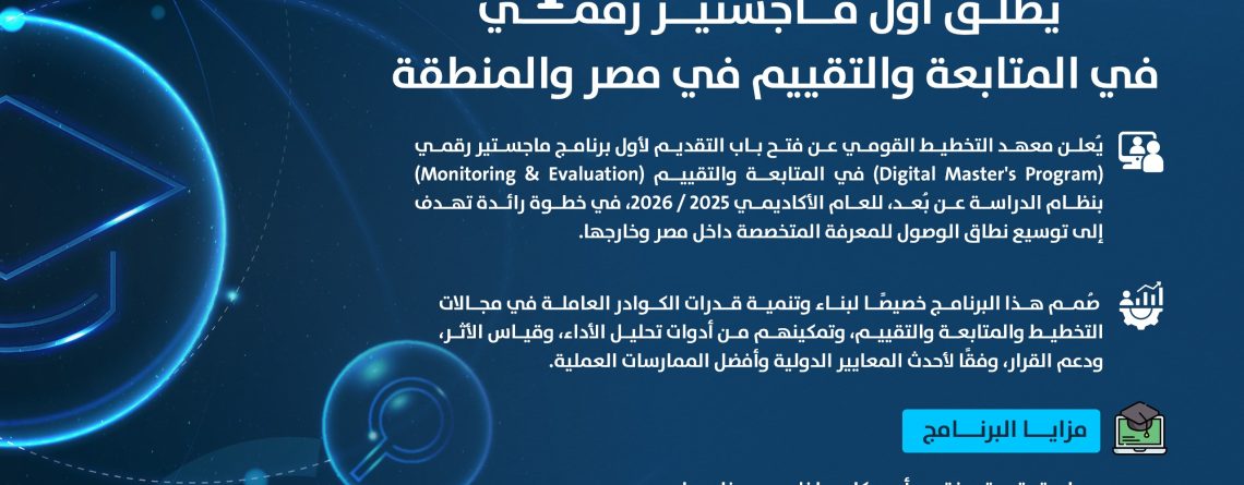يُعلن معهد التخطيط القومي عن فتح باب التقديم لأول *برنامج ماجستير مهني رقمي (Digital Master's Program)* في *المتابعة والتقييم (Monitoring & Evaluation)* بنظام الدراسة عن بُعد، للعام الأكاديمي *2025 / 2026*، في خطوة رائدة تهدف إلى توسيع نطاق الوصول للمعرفة المتخصصة داخل مصر وخارجها. *صُمم هذا...